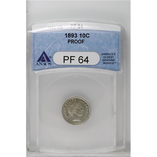 <B>1893<10C> PR64 ANACS.</B></I> This needle-sharp and lightly toned piece is pleasing despite a minor mark above the E in STATES. A mere 792 pieces were struck, a sizeable drop from the prior year's proof emission.