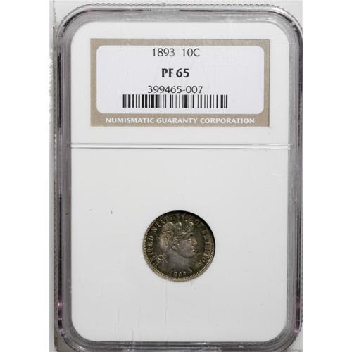 <B>1893<10C> PR65 NGC.</B></I> An appealing Gem with violet-gray and gold patina over the reflective surfaces. The devices are boldly detailed and distraction-free. Only 792 specimens were coined (9/06).