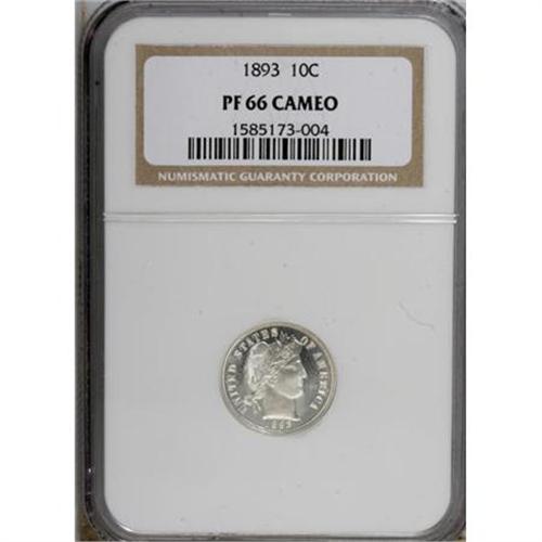 <B>1893 10C PR66 Cameo NGC.</B></I> The essentially untoned obverse shows the wonderful contrast for which early proof Barber dimes are known, while the reverse displays just a touch of milky haze within the wreath. One of just 792 specimens coined. Census: 12 in 66 Cameo, 17 finer (7/07).<BR><BR><b>Shipping:</b> Coins & Currency (<a target="_blank" href="http://www.heritageauctions.com/common/shipping.php">view shipping information</a>)