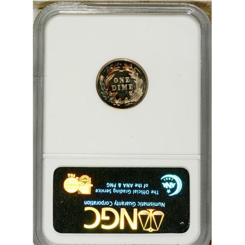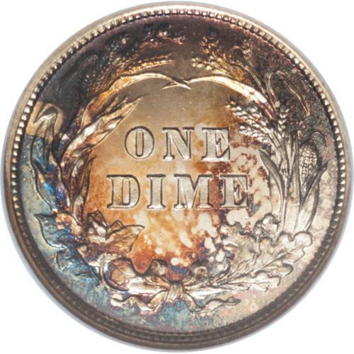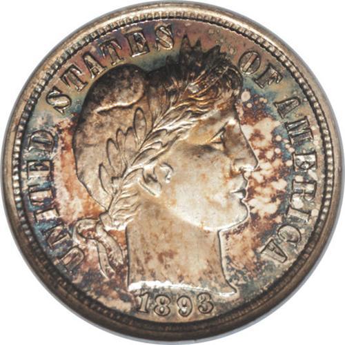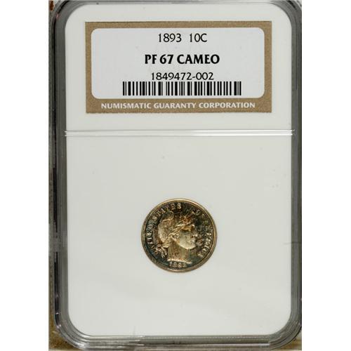 <B>1893 10C PR67 Cameo NGC.</B></I> The dappled original toning feature amber-gold, ocean-blue, and magenta predominating on both sides, with glints of untoned silver. Examination with a loupe reveals a couple of tiny contact marks on the cheek, without which this superlative, sharply struck, and lovely coin might have achieved an even finer grade. A great example that hails from the first of many Barber dime issues to have mintages below 1,000 proofs. Census: 10 in 67 Cameo, 6 finer (4/07).<BR><BR><b>Shipping:</b> Coins & Currency (<a target="_blank" href="http://www.heritageauctions.com/common/shipping.php">view shipping information</a>)