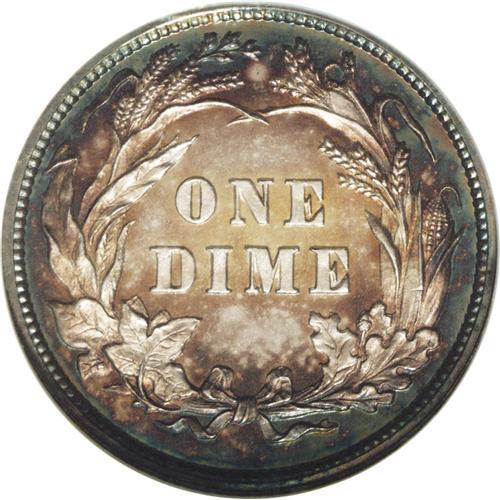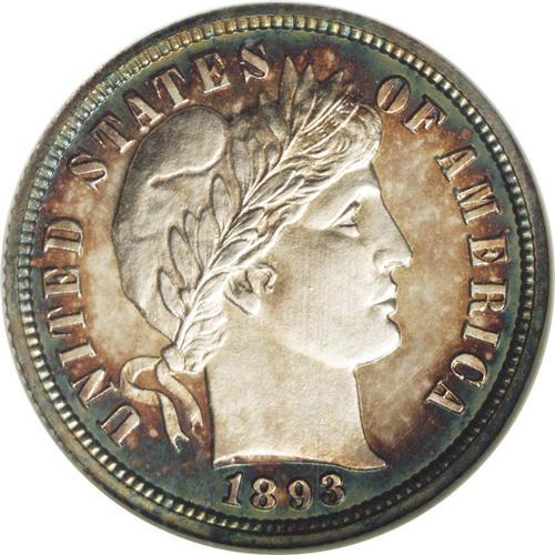 <B>1893<10C> PR67 NGC.</B></I> Both sides of this impeccable second-year proof are layered in a rich blend of cobalt-blue, purple, and sunset-golden toning, along with an occasional flash of bright rose. Even careful inspection with a glass fails to root out the most inconsequential blemish. Census: 20 in 67, 6 finer (3/06).