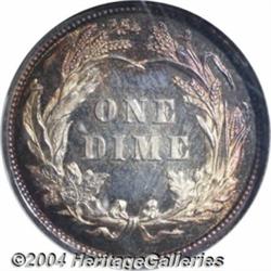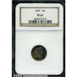 <B>1893<10C> PR67 NGC.</B></I> Alternating shades of cobalt-blue, crimson-red, and antique-gold overlay the obverse, the reverse is limited to reddish-gold tones. Boldly defined throughout, a Superb example. Population: 17 in 67, 7 finer (7/04). <BR><BR><B>Important notice:</B> Heritage usually auctions material at the rate of 200-250 lots per hour. On some occasions eBay Live bid software or the Internet may not be able to keep up with the pace of the auction. We recommend placing a realistic absentee bid now as insurance to avoid disappointment. Occasionally the auctioneer may eliminate or reject an eBay Live bid, and the auctioneer may also reopen a lot after the close of the eBay live bidding (usually because we missed an audience bid), and may reject your bid even if it shows you as the winning bidder. By bidding via eBay Live, you agree that Heritage may award the lot to another bidder at its sole discretion under the circumstances described above or any other reasonable circumstances. Since eBay bids are not shown to us until we open the lot on the floor, we treat those bids just like floor bids. In most cases the floor responds before the eBay bid is presented to us, due to Internet lag time, so for consistency we have made it a policy that floor bids are always considered first over tie eBay live bids. Also please note that all Heritage lots purchased through eBay Live carry a 20% Buyer's Premium. Please make sure you read the Terms and Conditions before you bid. </span></font></tr></table></td></tr></table>