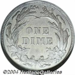 <table><tr><td><table><tr><td>1893 10C PR68 NGC. Like the coin just offered, this magnificent specimen rests near the pinnacle of perfection for the issue. The flashier of the two sides, the obverse, is beautifully accented in coppery-gold toning, while even steel-gray patination blankets the reverse. Population: 6 in 68, 1 finer (3/04). <BR><BR><B>Important notice:</B> Heritage usually auctions material at the rate of 200-250 lots per hour. On some occasions eBay Live bid software or the Internet may not be able to keep up with the pace of the auction. We recommend placing a realistic absentee bid now as insurance to avoid disappointment. Occasionally the auctioneer may eliminate or reject an eBay Live bid, and the auctioneer may also reopen a lot after the close of the eBay live bidding (usually because we missed an audience bid), and may reject your bid even if it shows you as the winning bidder. By bidding via eBay Live, you agree that Heritage may award the lot to another bidder at its sole discretion under the circumstances described above or any other reasonable circumstances. Since eBay bids are not shown to us until we open the lot on the floor, we treat those bids just like floor bids. In most cases the floor responds before the eBay bid is presented to us, due to Internet lag time, so for consistency we have made it a policy that floor bids are always considered first over tie eBay live bids. Also please note that all Heritage lots purchased through eBay Live carry a 20% Buyer's Premium. Please make sure you read the Terms and Conditions before you bid. <BR><BR><B>IMPORTANT ANNOUNCEMENT ABOUT RESERVES:</B> Heritage now divulges all reserves on its web site 7 days before every auction. If you want to know whether the reserve on this lot has been met, and if not, what the reserve amount is, please visit this lot page on the HeritageCoin.com web site, or email: bid@HeritageGalleries.com </span></font></td></tr></table></td></tr></table>