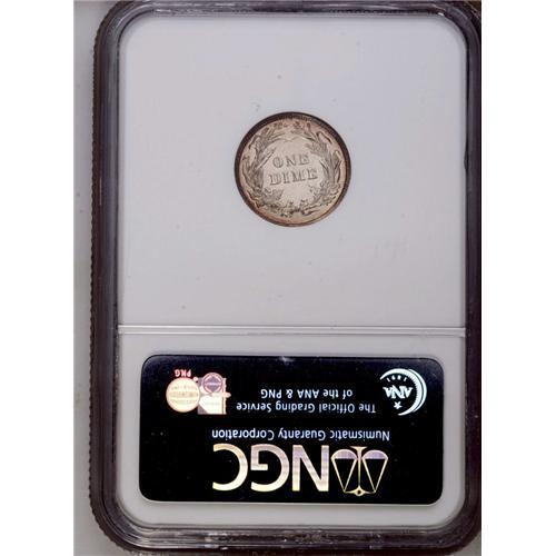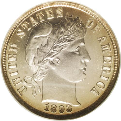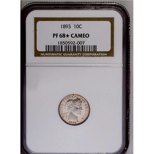 <B>1893<10C> PR68 <img border='0' src='http://www.heritagecoins.com/images/star.gif' width=10 height=10> Cameo NGC.</B></I> The portrait displays exceptional frost, and the wreath is also icy. These major devices provide obvious contrast with the darkly mirrored fields. Light rose toning adorns the borders. NGC has certified two proof 1893 dimes as PR68 <img border='0' src='http://www.heritagecoins.com/images/star.gif' width=10 height=10> Cameo, and only one piece has been certified finer, as PR69 without a Cameo or Star designation.
