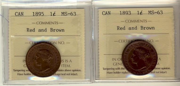 1893 & 1895 1¢ ICCS MS63RB. Lot of 2 coins.