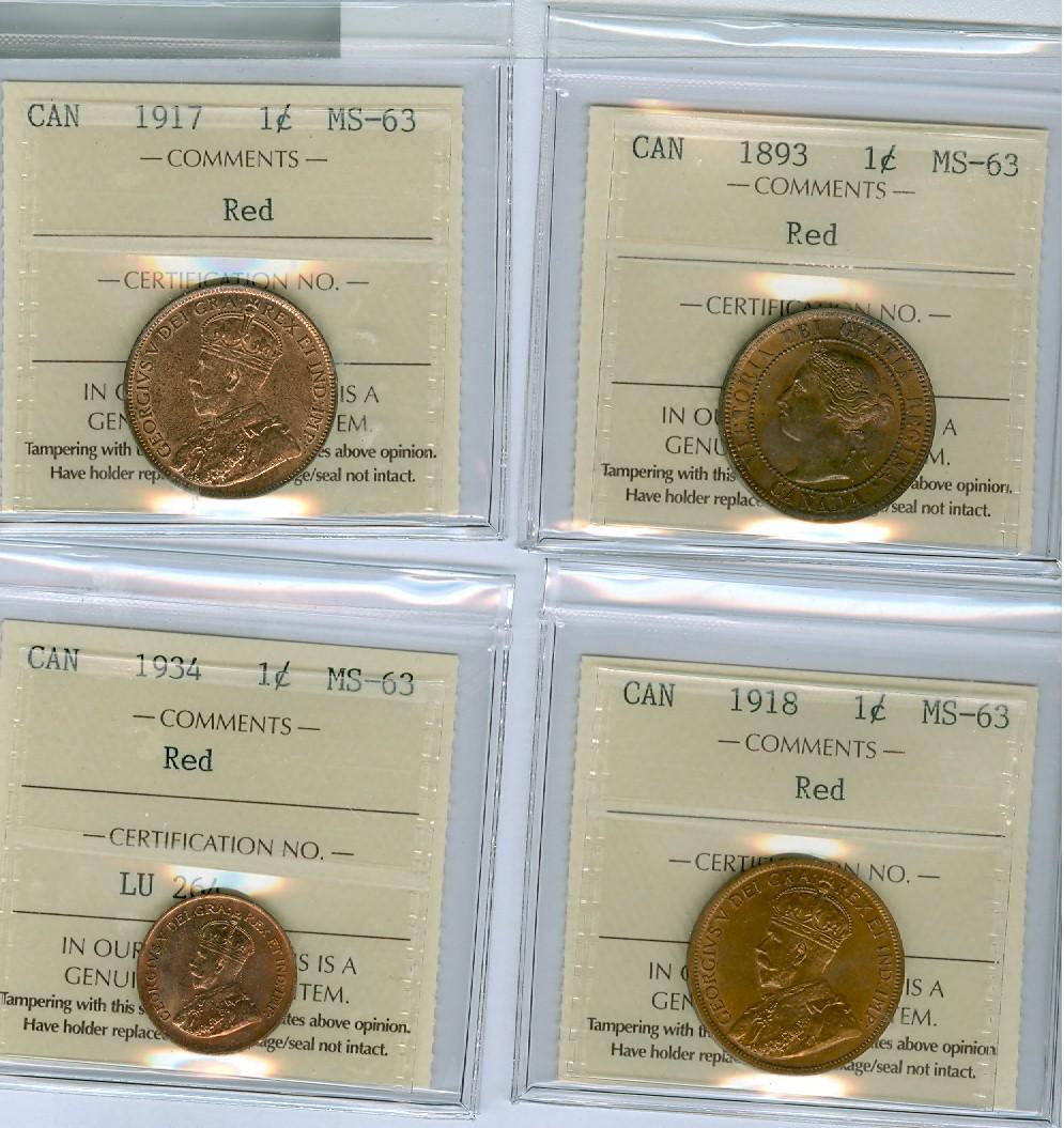 1893, 1917, 1918, 1934. Lot of 4 ICCS graded 1¢ coins, all MS63 Red.
