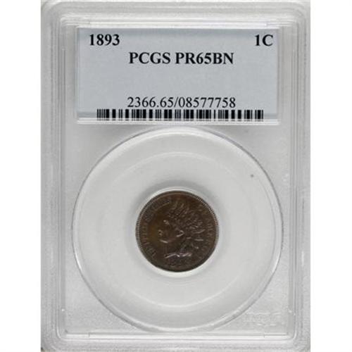 <B>1893 1C PR65 Brown PCGS.</B></I> Razor-sharp definition on the design elements befits a proof strike, and lovely light brown patination yields hints of underlying red. There are no bothersome marks to report. Population: 1 in 65 Brown, 2 finer (6/07).<BR><BR><b>Shipping:</b> Coins & Currency (<a target="_blank" href="http://www.heritageauctions.com/common/shipping.php">view shipping information</a>)