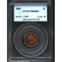 1893 1C PR66 Red PCGS. In an overall sense, the proof 1893 is roughly as common as the proof 1892. On the other hand, high quality survivors of the former date, and particularly those with fully intact luster, are appreciably scarcer than those of the 1892 delivery. A high end Gem in all regards, both the obverse and the reverse are awash in deeply set cherry-red hues. Direct angles reveal not only modest brightness in the fields, but reddish-orange undertones. We have no complaint about the needle sharp strike, and the surfaces are silky smooth from rim to rim. Population: 5 in 66 Red, just two are finer (1/03).From the Colburn Collection. Important notice: We expect to be auctioning lots at the rate of 200-250 per hour. On occasion eBay live bid software cannot keep up with the pace of the auctions where 4-5 lots per minute can hammer down, so we recommend that you place a realistic absentee bid now as insurance to avoid disappointment. Also please note that all Heritage/CAA lots purchased through eBay Live carry a 20% Buyer's Premium. Please make sure you read the Terms and Conditions.