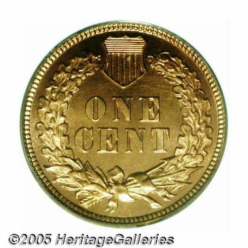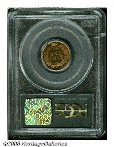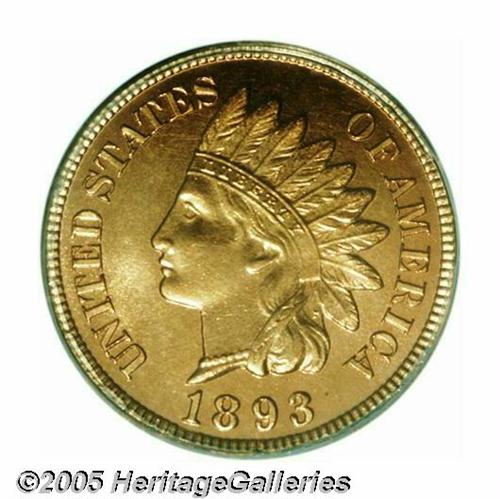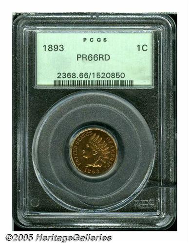 <B>1893<1C> PR66 Red PCGS.</B></I> Ron Sirna (2002) notes that, while generally available, the proof 1893 is "moderately scarce in full Red." Bountiful mint luster graces both sides of the present Gem in well blended copper-gold and red shades. There is no toning or significant mellowing as befits the PCGS color designation. Razor sharp striking definition characterizes the pleasingly reflective features. An important bidding opportunity for the informed Indian Cent specialist. Note: the older PCGS holder with green insert is noticeably cracked near the base. Population: 5 in 66, only two are finer as Red (3/05).