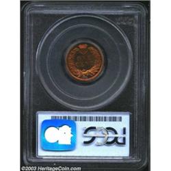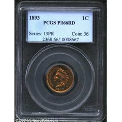 1893 1C PR66 Red PCGS. Ron Sirna (2002) notes that, while generally available, the proof 1893 is "moderately scarce in full Red." Bountiful mint luster graces both sides of the present Gem in well blended orange and red shades. There is no toning, as befits the PCGS color designation, but original, deeply set, olive tinged undertones are noted as the surfaces rotate under the light. Razor sharp striking definition characterizes the pleasingly reflective features. An important bidding opportunity for the informed Indian Cent specialist. Population: 5 in 66, only two are finer as Red (1/03). Important notice: We expect to be auctioning lots at the rate of 200-250 per hour. On occasion eBay live bid software cannot keep up with the pace of the auctions where 4-5 lots per minute can hammer down, so we recommend that you place a realistic absentee bid now as insurance to avoid disappointment. Also please note that all Heritage/CAA lots purchased through eBay Live carry a 20% Buyer's Premium. Please make sure you read the Terms and Conditions.