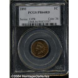 <B>1893<1C> PR66 Red PCGS.</B></I> While one of the more frequently encountered dates from the 1890s in high grade and with full red color, this is an exceptionally pleasing and problem-free proof type coin. The fields are bright and vibrant with well-balanced color on each side--pale red being the dominant color and source of the eye appeal on this lovely coin. Population: 5 in 66, 2 finer (9/04). <BR><BR><B>Important notice:</B> Heritage usually auctions material at the rate of 200-250 lots per hour. On some occasions eBay Live bid software or the Internet may not be able to keep up with the pace of the auction. We recommend placing a realistic absentee bid now as insurance to avoid disappointment. Occasionally the auctioneer may eliminate or reject an eBay Live bid, and the auctioneer may also reopen a lot after the close of the eBay live bidding (usually because we missed an audience bid), and may reject your bid even if it shows you as the winning bidder. By bidding via eBay Live, you agree that Heritage may award the lot to another bidder at its sole discretion under the circumstances described above or any other reasonable circumstances. Since eBay bids are not shown to us until we open the lot on the floor, we treat those bids just like floor bids. In most cases the floor responds before the eBay bid is presented to us, due to Internet lag time, so for consistency we have made it a policy that floor bids are always considered first over tie eBay live bids. Also please note that all Heritage lots purchased through eBay Live carry a 20% Buyer's Premium. Please make sure you read the Terms and Conditions before you bid.