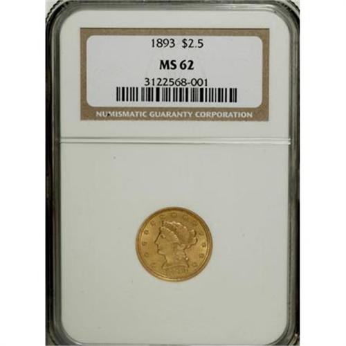 <B>1893 $2 1/2 MS62 NGC.</B></I> NGC Census: (194/290). PCGS Population (139/295). Mintage: 30,000. Numismedia Wsl. Price for NGC/PCGS coin in MS62: $500. (#7845)<BR><BR><B>Coin Engraver:</B> Christian Gobrecht<BR><BR><b>Shipping:</b> Coins & Currency (<a target="_blank" href="http://www.heritageauctions.com/common/shipping.php">view shipping information</a>)