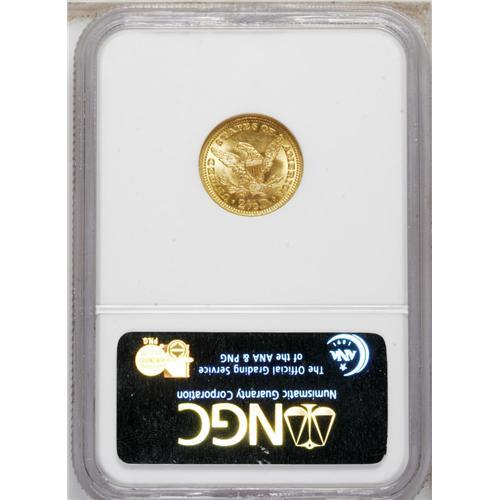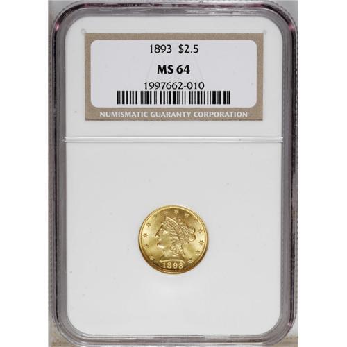 <B>1893<$2 1/2> MS64 NGC.</B></I> A boldly struck orange-gold example with subtle green overtones. The surfaces of this near-Gem are quite lustrous and mostly well-preserved, though a couple of abrasions appear on Liberty's nose.