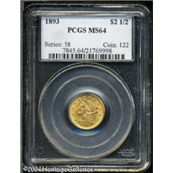 1893 $2 1/2 MS64 PCGS. Well struck with highly att <B>1893 $2 1/2 MS64 PCGS.</B></I> Well struck with highly attractive peach and chartreuse coloration, and carefully preserved surfaces that are almost mark-free, save for a tiny scrape in the left reverse field area. Only 30,000 pieces were issued. Population: 83 in 64, 36 finer (11/04). <BR><BR><B>Important notice:</B> Heritage usually auctions material at the rate of 200-250 lots per hour. On some occasions eBay Live bid software or the Internet may not be able to keep up with the pace of the auction. We recommend placing a realistic absentee bid now as insurance to avoid disappointment. Occasionally the auctioneer may eliminate or reject an eBay Live bid, and the auctioneer may also reopen a lot after the close of the eBay live bidding (usually because we missed an audience bid), and may reject your bid even if it shows you as the winning bidder. By bidding via eBay Live, you agree that Heritage may award the lot to another bidder at its sole discretion under the circumstances described above or any other reasonable circumstances. Since eBay bids are not shown to us until we open the lot on the floor, we treat those bids just like floor bids. In most cases the floor responds before the eBay bid is presented to us, due to Internet lag time, so for consistency we have made it a policy that floor bids are always considered first over tie eBay live bids. Also please note that all Heritage lots purchased through eBay Live carry a 20% Buyer's Premium. Please make sure you read the Terms and Conditions before you bid. This lot is being auctioned in conjunction with a live floor auction by Heritage Galleries & Auctioneers. All final auction and invoice information will be supplied by Heritage Galleries & Auctioneers, and all other information should be considered preliminary. Lot:6523