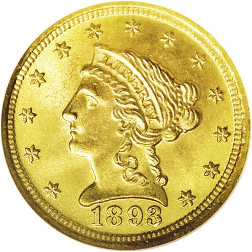 <B>1893<$2 1/2> MS66 NGC.</B></I> Most of the quarter eagles from the early 1890s are elusive, including this date with a mintage of just 30,000 coins. This Premium Gem specimen has deep olive-gold color at the borders with extremely sharp design elements. The surfaces are exceptional. Few high-grade examples of this issue are known, and NGC has certified only a single better example. Census: 18 in 66, 1 finer (8/06).