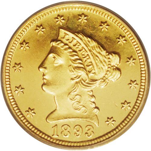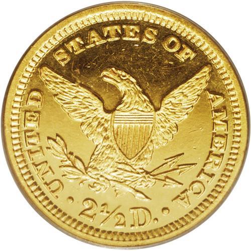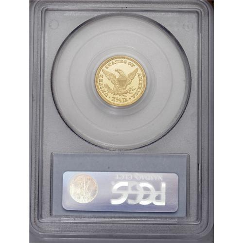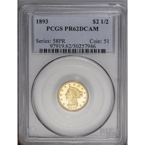 <B>1893 $2 1/2 PR62 Deep Cameo PCGS.</B></I> This proof quarter eagle issue registered a miniscule production of 106 pieces. Faint repunching on the last two digits in the date is visible under a loupe and serves to distinguish the proof survivors from their business strike counterparts. The near-bottomless fields boldly reflect the thickly frosted devices. Free of all but a few handling marks, the surfaces display some mottled, milky-white coloration.