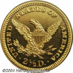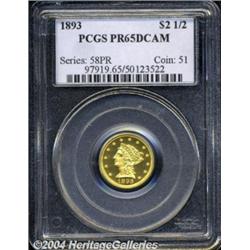 <B>1893<$2 1/2> PR65 Deep Cameo PCGS.</B></I> A beautifully contrasted specimen that is diminished somewhat in its intensity by a coating of light, milky patina. The surfaces are primarily a soft green-gold hue, with suggestions of delicate reddish color about the margins. Production of proof Quarter Eagles amounted to just 106 pieces in 1893, of which perhaps half survive as recognizable proofs. Population: 4 in 65, 3 finer (7/04). <BR><BR><B>Important notice:</B> Heritage usually auctions material at the rate of 200-250 lots per hour. On some occasions eBay Live bid software or the Internet may not be able to keep up with the pace of the auction. We recommend placing a realistic absentee bid now as insurance to avoid disappointment. Occasionally the auctioneer may eliminate or reject an eBay Live bid, and the auctioneer may also reopen a lot after the close of the eBay live bidding (usually because we missed an audience bid), and may reject your bid even if it shows you as the winning bidder. By bidding via eBay Live, you agree that Heritage may award the lot to another bidder at its sole discretion under the circumstances described above or any other reasonable circumstances. Since eBay bids are not shown to us until we open the lot on the floor, we treat those bids just like floor bids. In most cases the floor responds before the eBay bid is presented to us, due to Internet lag time, so for consistency we have made it a policy that floor bids are always considered first over tie eBay live bids. Also please note that all Heritage lots purchased through eBay Live carry a 20% Buyer's Premium. Please make sure you read the Terms and Conditions before you bid. </span></font></tr></table></td></tr></table>