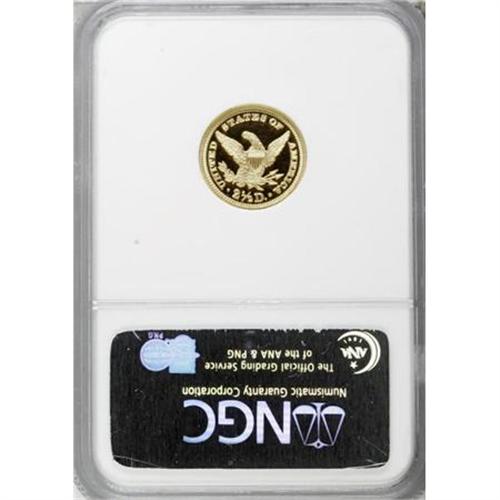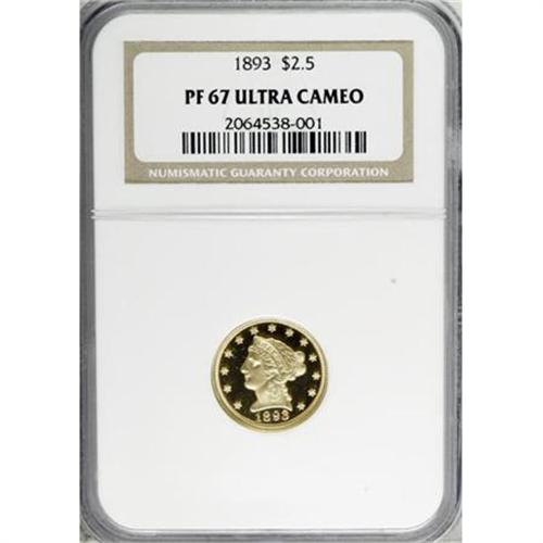 <B>1893 $2 1/2 PR67 Ultra Cameo NGC.</B></I> The 1893 proof quarter eagle continued the tradition of low mintages for both proofs and business strikes. Business strike production remained, for the most part, below the 30,000 mark until the turn of the century. Proof output had always been low, generally in the 25-35 piece range until 1880. Then it streaked all the way up to the 1893 level of 106 pieces. The output of these proof gold coins was so minuscule compared to the production levels of the U.S. mint today, it is truly surprising that as many have survived 100+ years at all, much less in the Superb condition seen here. <BR> Of the 106 proof quarter eagles struck in this year, probably no more than 45-55 pieces are extant today in all grades. At the ultimate (PR67 Ultra Cameo) grade level, only two other pieces have been so graded by the two major services, both by NGC. The only other coin in a comparable grade is a PR67 Cameo, also certified by NGC. <BR> As with all proofs of this date, the 93 in the date is noticeably repunched to the left. This was identified in the Pittman catalog by David Akers as a characteristic of this proof-only die. While the majority of surviving 1893 proof quarter eagles are either Cameo or Deep (Ultra) Cameo, high grade survivors are rare, as indicated above. This piece shows the crinkled, orange-peel effect common to many proof gold coins produced in the 1880s and 1890s. The devices are heavily frosted and yield a strong two-toned effect on each side. The surfaces are essentially defect-free, which makes it difficult to establish a pedigree for this important proof striking. An outstanding opportunity for the collector to acquire a 19th century date of cameo proof gold in the ultimate grade. <BR><I>From The Carlton Woods Collection.</B></I><BR><BR><b>Shipping:</b> Coins & Currency (<a target="_blank" href="http://www.heritageauctions.com/common/shipping.php">view shipping information</a>)