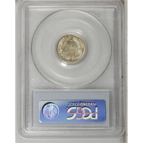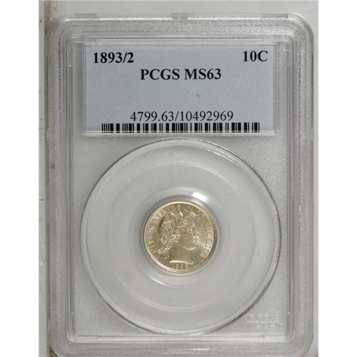 <B>1893/2<10C> MS63 PCGS.</B></I> The horizontal bottom stroke of the 2 is plain within the lower loop of the 3. This coin shows a few straight abrasions near Liberty's cheek, and an old fingerprint on the head and other areas of the coin have toned into drab ochre color in an irregular pattern. Brilliant otherwise, and an affordable specimen of this rare key-date Barber dime issue. Population: 2 in 63, 12 finer (9/06).