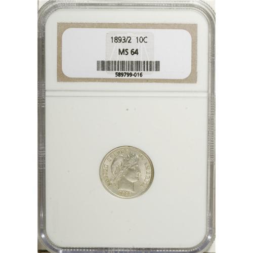 <B>1893/2 10C MS64 NGC.</B></I> A horizontal bar in the lower loop of the 3 is clearly visible on this sharply detailed Mint State example. Frosty luster is evident on both sides with brilliant silver surfaces and subliminal gold toning on the obverse. This is a rare variety with few Mint State specimens.<BR><I>From The Park Cities Collection.</B></I><BR><BR><b>Shipping:</b> Coin/Currency (<a target="_blank" href="http://www.heritageauctions.com/common/shipping.php">view shipping information</a>)
