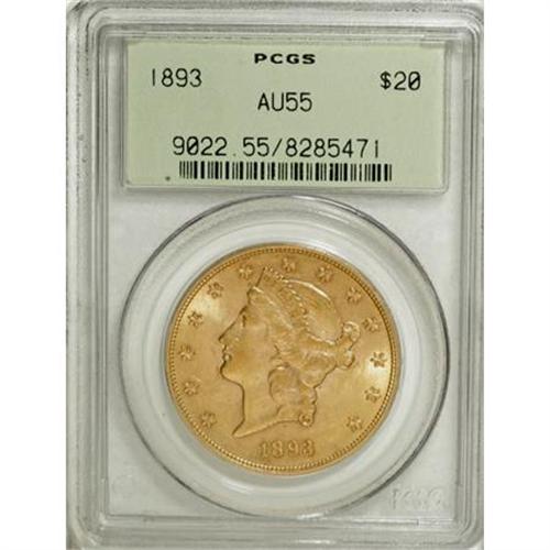 <B>1893 $20 AU55 PCGS.</B></I> PCGS Population (45/2920). NGC Census: (7/4305). Mintage: 344,200. Numismedia Wsl. Price for NGC/PCGS coin in AU55: $702. (#9022)<BR><BR><B>Coin Engraver:</B> James B. Longacre<BR><BR><b>Shipping:</b> Coins & Currency (<a target="_blank" href="http://www.heritageauctions.com/common/shipping.php">view shipping information</a>)