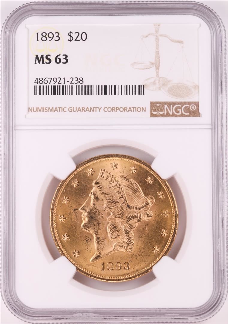 One 1893 $20 Liberty Head Double Eagle Gold Coin NGC MS63. NGC Certified.