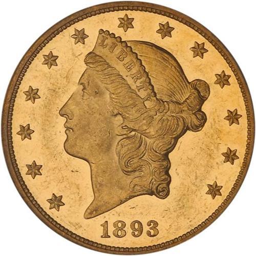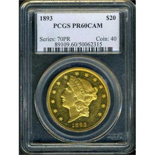 <b>1893 $20 Liberty. PCGS graded PF60 CAM.</b> Pop: 1/1. The otherwise golden-amber color deepens to iridescent-gold shadings in select areas with the highlights more golden brown that the open spaces; some scattered contact marks and obvious abrasions limit the grade to Proof 60, but there is no question of the smooth proof status in the fields nor the sharp devices. The mint saw fit to manufacture just 59 Proofs in 1893 - to fill orders from collectors. It is hard to believe there were so orders back then, how times have changed!
