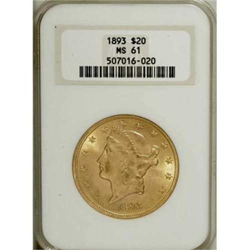<B>1893 $20 MS61 NGC.</B></I> NGC Census: (1511/2399). PCGS Population (743/1748). Mintage: 344,200. Numismedia Wsl. Price for NGC/PCGS coin in MS61: $715. (#9022)<BR><BR><B>Coin Engraver:</B> James B. Longacre<BR><BR><b>Shipping:</b> Coins & Currency (<a target="_blank" href="http://www.heritageauctions.com/common/shipping.php">view shipping information</a>)