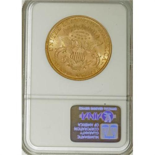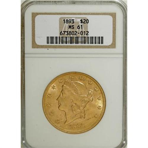 <B>1893 $20 MS61 NGC.</B></I> The pale yellow-gold surfaces show subtle green accents and minor alloy at the lower obverse. Crisply struck with a number of light to moderate marks that account for the grade.<BR><BR><B>Coin Engraver:</B> James B. Longacre<BR><BR><b>Shipping:</b> Coins & Currency (<a target="_blank" href="http://www.heritageauctions.com/common/shipping.php">view shipping information</a>)