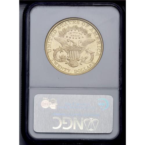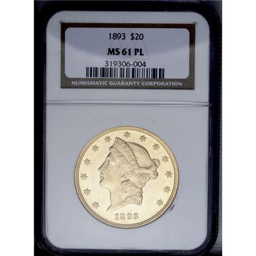 <B>1893<$20> MS61 Prooflike NGC.</B></I> Only four coins have been given this grade by NGC and only one has been graded in 62. The devices are lightly frosted and the fields have great reflectivity. Sharply struck with yellow-gold surfaces and marks appropriate for the grade.<BR><I>From The New York Eye Appeal Collection.</B></I>