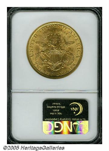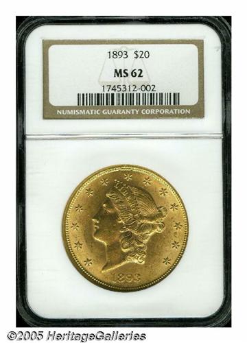 <B>1893<$20> MS62 NGC.</B></I> Bright surfaces display a yellow-gold patina, and a few minor contact marks scattered over each side, especially on the obverse. The design elements are well impressed throughout, with no areas revealing hints of softness.