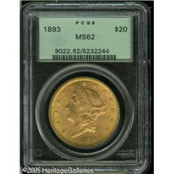 <B>1893 $20 MS62 PCGS.</B></I> Orange and olive hues enrich this lustrous and intricately struck Liberty Twenty. A small piece has broken off the upper right reverse edge of the older generation holder. Lot:9233