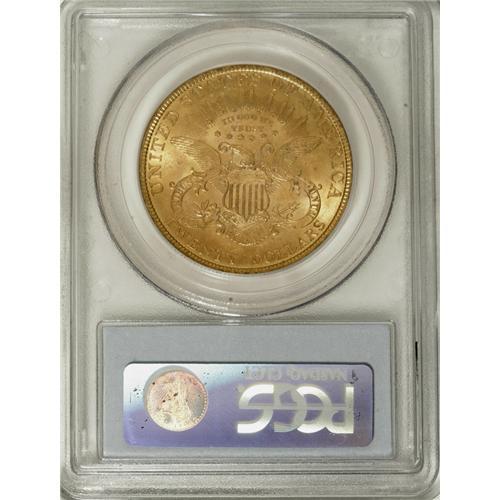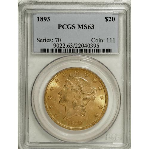 <B>1893 $20 MS63 PCGS.</B></I> A highly attractive example that is only occasionally found any finer than this piece, with just 58 finer coins certified by PCGS. This one has frosty luster with intermingled lemon-yellow, pinkish-rose, and olive-gold color.<BR><BR><b>Shipping:</b> Coins & Currency (<a target="_blank" href="http://www.heritageauctions.com/common/shipping.php">view shipping information</a>)