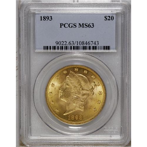 <B>1893 $20 MS63 PCGS.</B></I> A nicely struck butter-yellow example that has pleasing luster. A light copper stain is noted near 9 o'clock on the reverse, and minor abrasions appear on each side.<BR><BR><b>Shipping:</b> Coin/Currency (<a target="_blank" href="http://www.heritageauctions.com/common/shipping.php">view shipping information</a>)