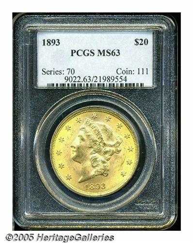 <B>1893<$20> MS63 PCGS.</B></I> Satiny with ample mint frost on the devices and pleasing olive-gold peripheral highlights. Strong eye appeal for the assigned grade.