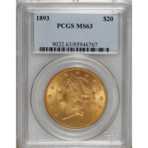 <B>1893 $20 MS63 PCGS.</B></I> The obverse is primarily olive-gold, while the reverse has substantial peach toning. Lustrous and nicely struck with consistently clean surfaces for the grade.<BR><BR><b>Shipping:</b> Coins & Currency (<a target="_blank" href="http://www.heritageauctions.com/common/shipping.php">view shipping information</a>)