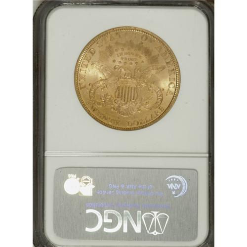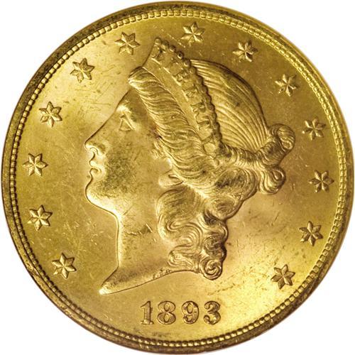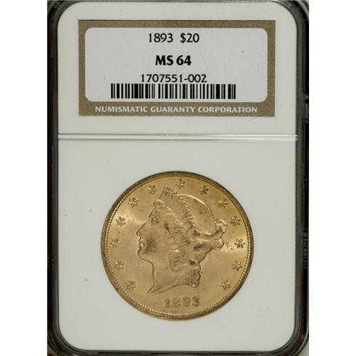<B>1893 $20 MS64 NGC.</B></I> A shining Choice representative of this Philadelphia issue, one that was shipped in quantity to Europe, which explains its considerable survival rate. The apricot-gold and orange-gold fields have vibrant luster, and the minimally marked devices have solid detail. One of the more available late 19th century issues, though exceedingly difficult to acquire any finer; NGC has graded just three Gem or better coins, and PCGS has certified none (3/07).<BR><BR><b>Shipping:</b> Coins & Currency (<a target="_blank" href="http://www.heritageauctions.com/common/shipping.php">view shipping information</a>)