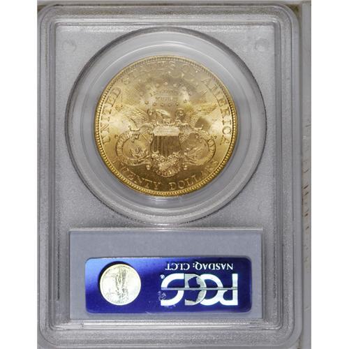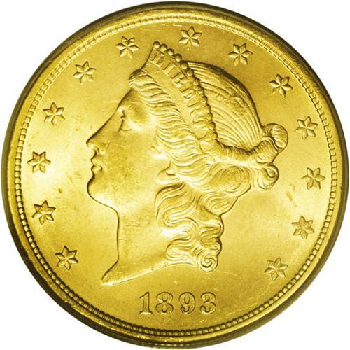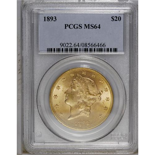 <B>1893<$20> MS64 PCGS.</B></I> The 1893 is among the many Liberty double eagle issues that is easily secured in bagmarked Uncirculated grades, but emerges as a significant scarcity above the Select level. This lovely almond-gold near-Gem has luxurious luster and impressively unperturbed surfaces. The reverse is well struck, while the obverse center shows a hint of softness. Population: 60 in 64, 0 finer (9/06).