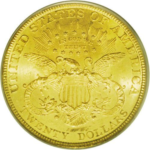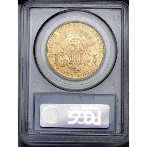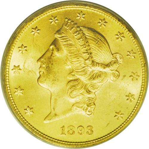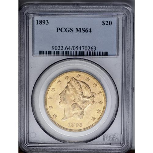 <B>1893<$20> MS64 PCGS.</B></I> While the 1893 half eagle and eagle each have mintages well above 1 million pieces, the Philadelphia Mint double eagle is a better date at the MS64 level. The mintage was less than 350,000 pieces, and although bagmarked Uncirculated examples are available, NGC and PCGS combined have certified only 99 pieces in MS64 (5/06). PCGS has yet to certify any above MS64. The present boldly struck near-Gem boasts full luster, and marks are generally limited to a scuff beneath the tail feathers and minor grazes on the cheek. Population: 54 in 64, 0 finer (5/06).