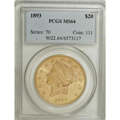 <B>1893 $20 MS64 PCGS.</B></I> This sharply struck and thoroughly lustrous near-Gem is uncommonly free from the scuffs and bagmarks associated with Uncirculated Liberty twenties from the 1890s. In fact, the present piece approaches a higher grade from a technical perspective, since a thin mint-made grease streak near the hairbun is all that denies classification as a Gem. Population: 56 in 64, 0 finer (10/07).<BR><I>From The Fleur Wales-Baillie Collection.</B></I><BR><BR><B>Coin Engraver:</B> James B. Longacre<BR><BR><b>Shipping:</b> Coins & Currency (<a target="_blank" href="http://www.heritageauctions.com/common/shipping.php">view shipping information</a>)