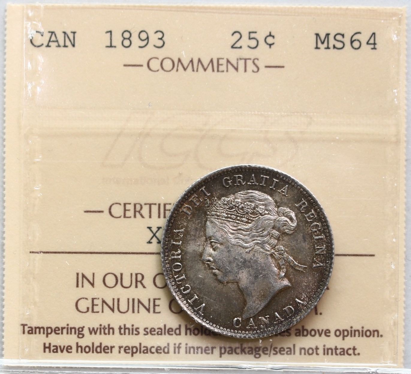 1893 25¢ ICCS Choice Mint State-64. Light gold, russet and champagne tones over full underlying lustre. Not often handled, a highly attractive and beautiful example to add to the best of collections. A perfect opportunity to acquire this wonderful key date!