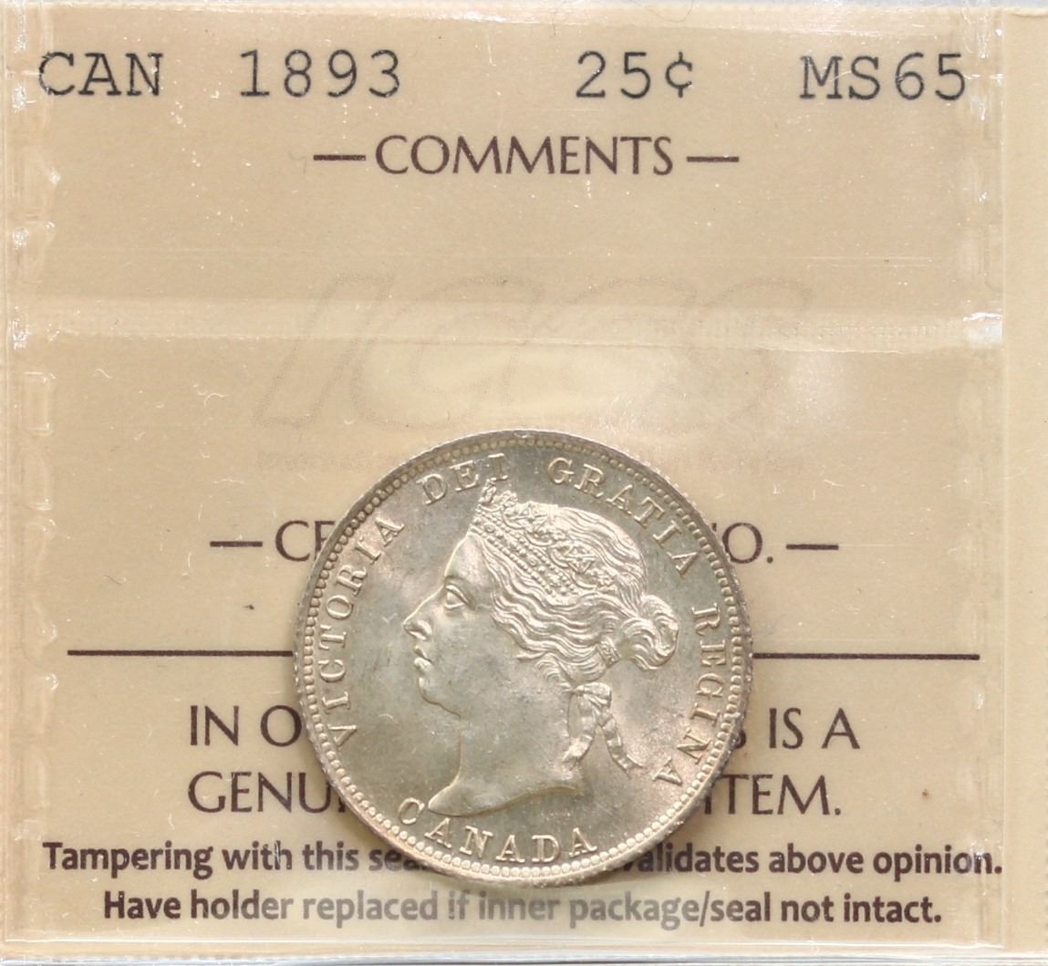 1893 25¢ ICCS Gem Mint State-65. Fully brilliant and lustrous. Wow! Not often handled, a highly attractive and beautiful example to add to the best of collections. A perfect opportunity to acquire this wonderful key date!