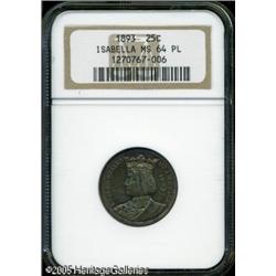 <B>1893 25C Isabella MS64 Prooflike NGC.</B></I> Well struck with flashy, prooflike reflectivity in the fields, lovely turquoise, purple-rose, lemon-beige, and bright amber toning, and a handful of tiny contact marks, divided between obverse and reverse, that limit the numerical grade of the piece. Population: 30 in MS64 Prooflike, 11 finer in Prooflike (1/05). Lot:8412