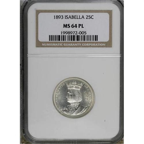 <B>1893 25C Isabella MS64 Prooflike NGC.</B></I> Well struck with shimmering, prooflike fields and boldly struck devices. A few trivial marks and spots limit the grade. Still a pleasing and conditionally scarce example. Census: 34 in 64 Prooflike, 14 finer in Prooflike (1/08). <BR><BR><b>Shipping:</b> Coins & Currency (<a target="_blank" href="http://www.heritageauctions.com/common/shipping.php">view shipping information</a>)