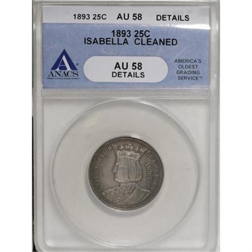 <B>1893 25C Isabella Quarter--Cleaned--ANACS AU58 Details.</B></I> NGC Census: (183/2825). PCGS Population (336/3661). Mintage: 24,214. Numismedia Wsl. Price for NGC/PCGS coin in AU58: $500. (#9220)<BR><BR><b>Shipping:</b> Coins & Currency (<a target="_blank" href="http://www.heritageauctions.com/common/shipping.php">view shipping information</a>)