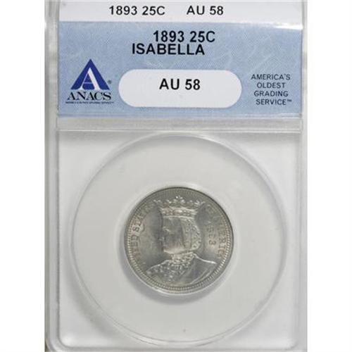 <B>1893 25C Isabella Quarter AU58 ANACS.</B></I> NGC Census: (184/2823). PCGS Population (337/3673). Mintage: 24,214. Numismedia Wsl. Price for NGC/PCGS coin in AU58: $500. (#9220)<BR><BR><b>Shipping:</b> Coins & Currency (<a target="_blank" href="http://www.heritageauctions.com/common/shipping.php">view shipping information</a>)