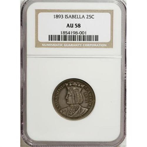 <B>1893 25C Isabella Quarter AU58 NGC.</B></I> NGC Census: (175/2768). PCGS Population (326/3540). Mintage: 24,214. Numismedia Wsl. Price for NGC/PCGS coin in AU58: $515. (#9220)<BR><BR><b>Shipping:</b> Coins & Currency (<a target="_blank" href="http://www.heritageauctions.com/common/shipping.php">view shipping information</a>)