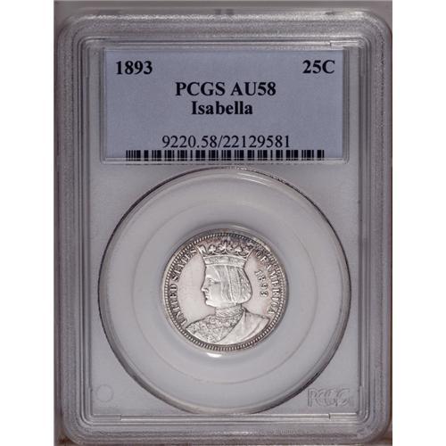 <B>1893 25C Isabella Quarter AU58 PCGS.</B></I> Sharply struck and lightly toned with much of the original mint luster still intact. An affordable alternative to a Mint State piece.