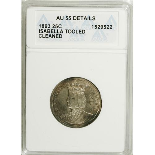 <B>1893 25C Isabella Quarter--Cleaned, Tooled--ANACS. AU55 Details.</B></I> NGC Census: (30/2892). PCGS Population (149/3860). Mintage: 24,214. Numismedia Wsl. Price: $500. (#9220)<BR><BR><b>Shipping:</b> Coins & Currency (<a target="_blank" href="http://www.heritageauctions.com/common/shipping.php">view shipping information</a>)