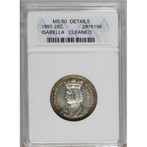 <B>1893<25C> Isabella Quarter--Cleaning--ANACS. MS60 Details.</B></I> Golden-brown and apple-green margins frame brilliant interiors. Luster is extensive if somewhat diminished. A precisely struck and hairlined example of this early commemorative type.
